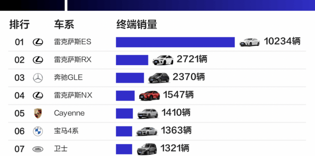其他进口车型中,奔驰GLE售出2370辆,宝马4系售出1363辆。保时捷卡宴和帕拉梅拉分别售出1410辆和1054辆,丰田埃尔法则售出652辆。从年度累计销量来看,雷克萨斯ES依然领跑,雷克萨斯RX和奔驰GLE紧随其后,形成稳定的销量梯队。