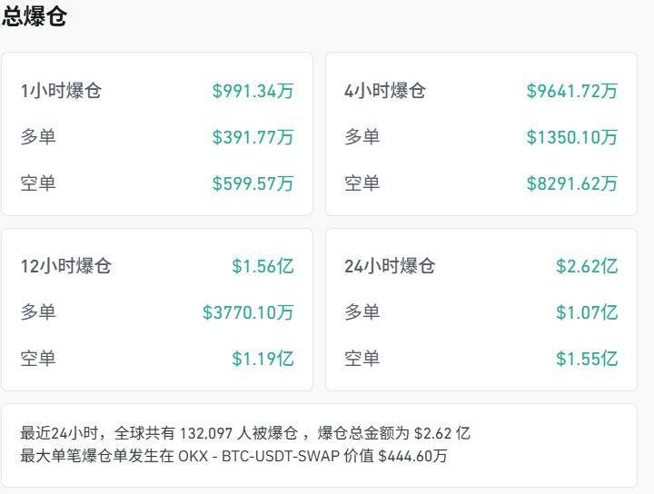加密货币同样集体上涨,比特币一度涨超114100美元,以太坊突破4400美元,过去24小时内均涨超2%,全球超13.2万人被爆仓,总金额2.62亿美元。