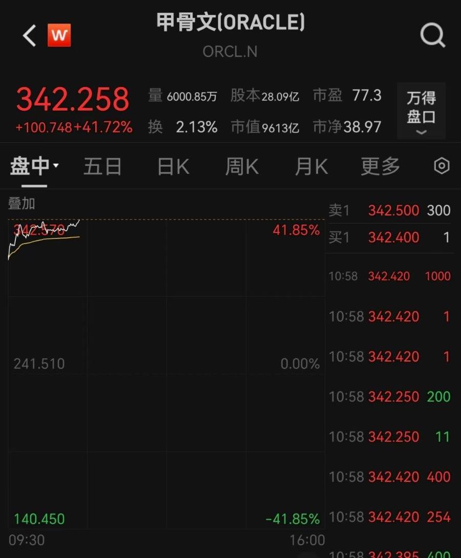 今晚最大亮点当数甲骨文,该股跳空高开,截至北京时间22:58,涨幅飙升近42%,创1992年以来最大盘中涨幅。截至周二收盘,甲骨文股价今年已累计上涨46%。